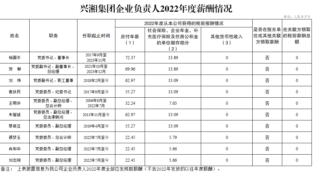 興湘集團(tuán)企業(yè)負(fù)責(zé)人2022年度薪酬情況